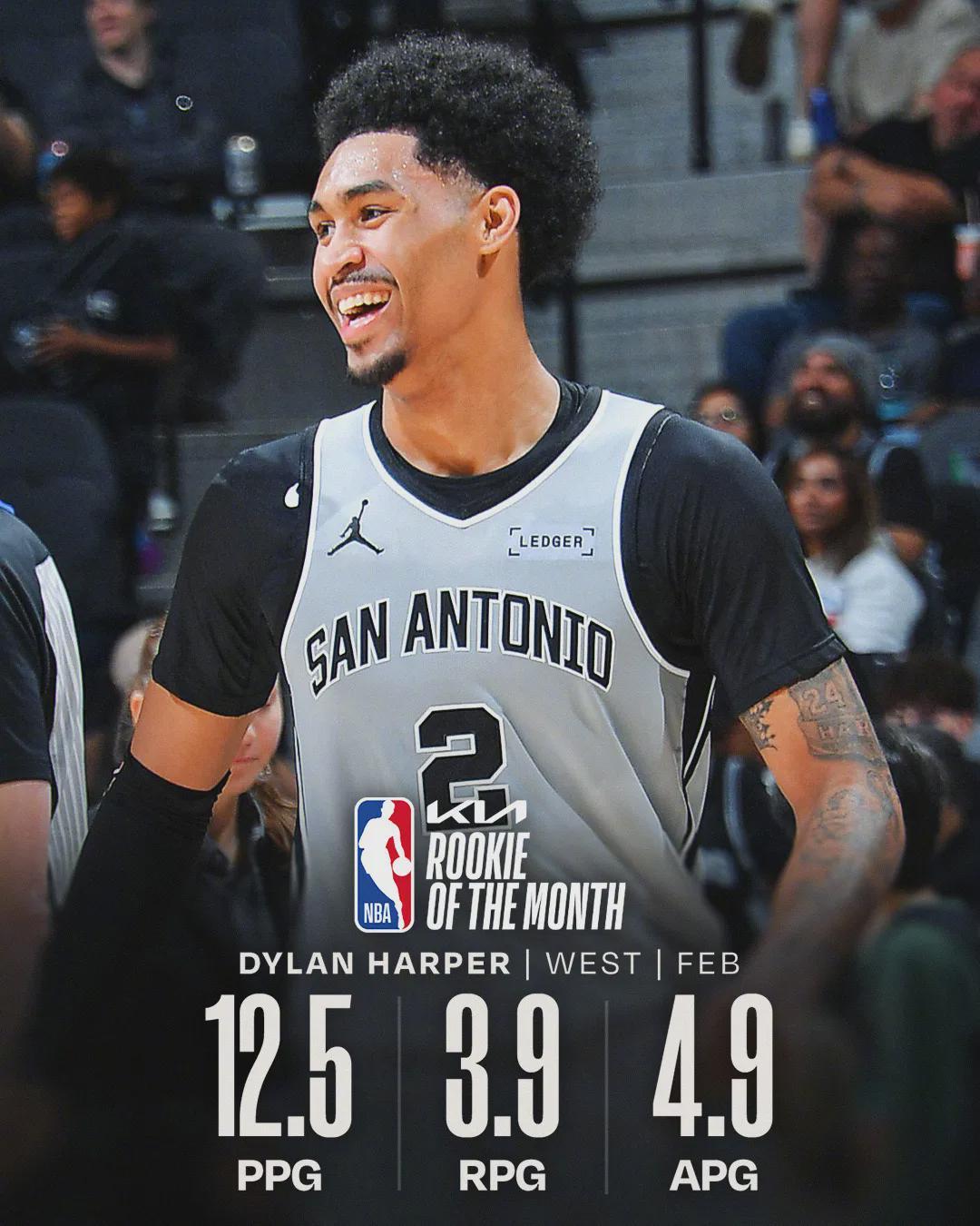 刚刚过去的2月份,马刺11胜0负,联盟最佳战绩,文班亚马场均22.5分11.3篮板3.5盖帽。全明星之后文班一共送出26记盖帽,篮网全队只有24记盖帽,雄鹿全队23记盖帽。哈珀在2月份场均12.5分3.9篮板4.9助攻,投篮命中率55.4%。